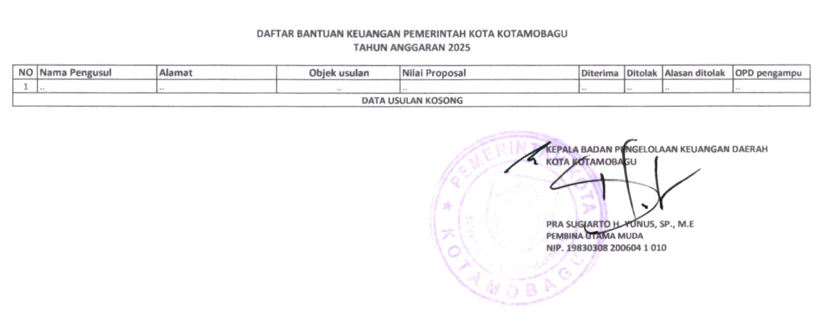 Pemerintah Kota Kotamobagu melalui perangkat daerah terkait menyampaikan informasi mengenai Daftar Bantuan Keuangan Pemerintah Kota Kotamobagu Tahun Anggaran 2025. Hingga saat ini, daftar usulan bantuan keuangan tersebut masih kosong dan belum terdapat entitas atau pihak yang tercatat sebagai penerima usulan pada tahun anggaran dimaksud.
